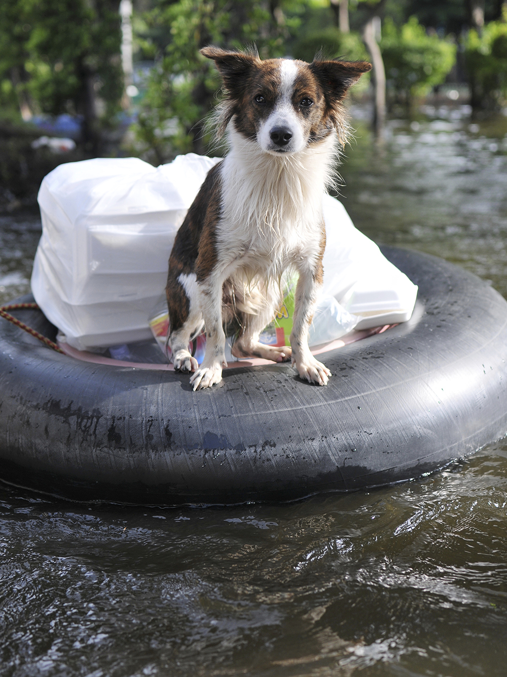 Have a pet emergency kit. A pet emergency kit should include a week's worth of food and water, your pet's medications, medical and vaccination records and a copy of your pet insurance policy, if you have one. These documents should be kept in a waterproof container. Also, keep some recent pictures of your pet handy.