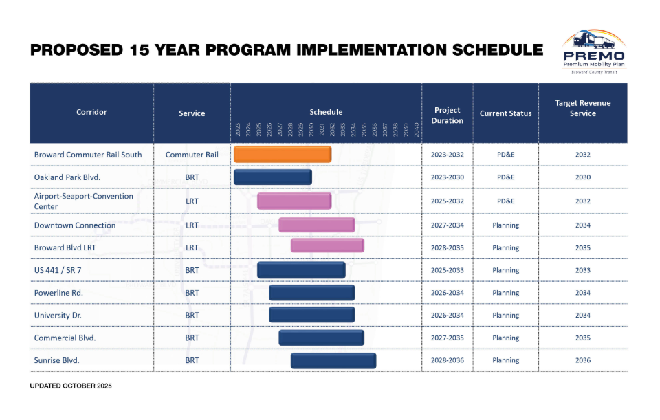 With the approval of the PREMO Plan, Broward County is quickly moving premium transit projects to construction. See the project schedule below and learn more about the PREMO Plan and PREMO Projects.